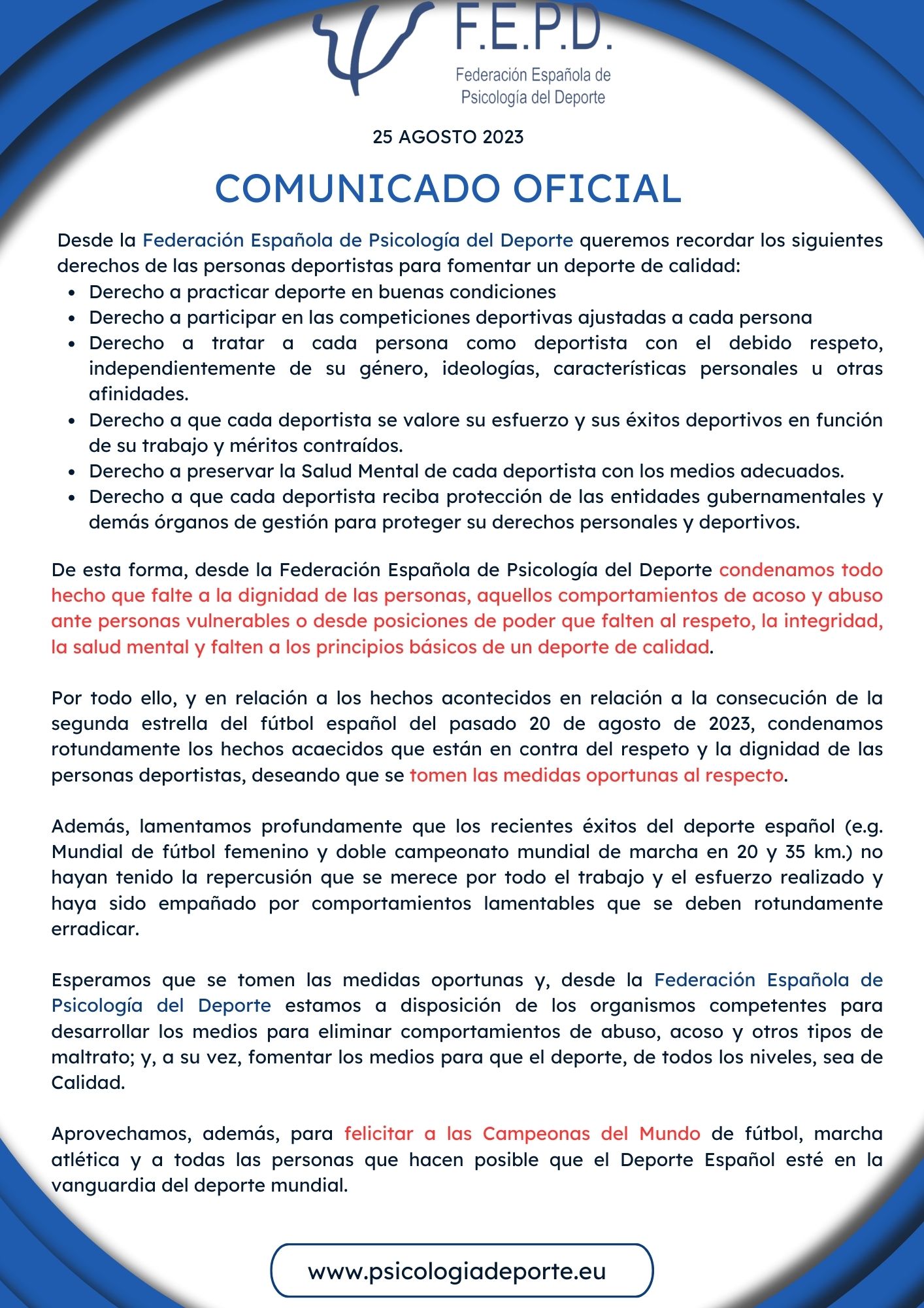 COMUNICADO OFICIAL de la Federación Española de Psicología del Deporte (25 agosto 2023)