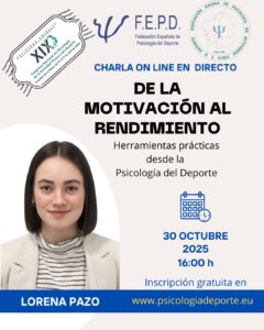Conjuntamente desde la Asociación Galega de Psicoloxía da Actividade Física e o Deporte y la Federación Española de Psicología del Deporte, el próximo jueves 30 de octubre de 2025, a las 16 horas (hora de España peninsular) se llevará a cabo en formato on line, por zoom, la charla «De la Motivación al Rendimiento: herramientas prácticas de Psicología del Deporte». La charla será impartida por la psicóloga del deporte Lorena Pazo.