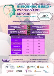 Los próximos días 20 y 21 de febrero de 2026, se celebrará en la Universitat Jaume I de Castellón de la Plana (España), la tercera edición del Encuentro Ibérico + de Psicología del Deporte, tras la primera que se realizó en Barcelona en 2024, y la segunda en Oporto el año pasado.