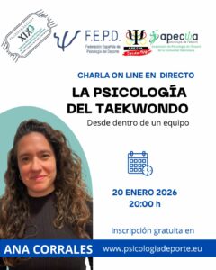 Conjuntamente desde la Associació de Psicologia de l’Esport de la Comunitat Valenciana (APECVA) y la Federación Española de Psicología del Deporte, el próximo martes 20 de enero de 2026, a las 20 horas (hora de España peninsular) se llevará a cabo en formato on line, por zoom, la charla «Psicología del Taekwondo: desde dentro de un equipo». La charla será impartida por la psicóloga del deporte Ana Corrales.